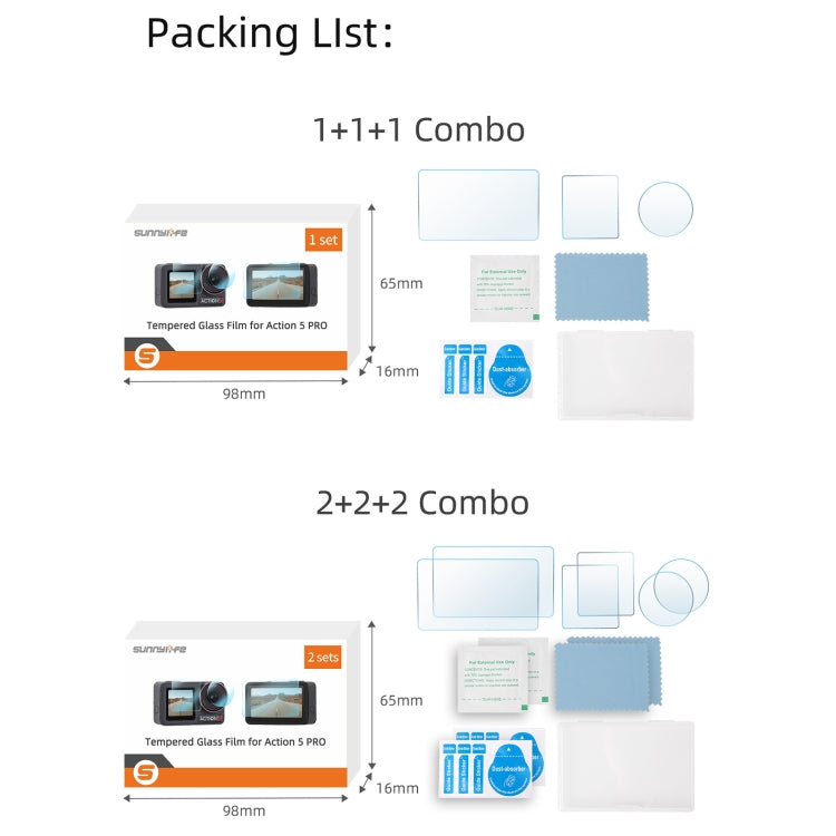 Für DJI Osmo Action 5 Pro Sunnylife 3-in-1-Objektivschutz, gehärtete Glasfolien für Vorder- und Rückseite, 1 + 1 + 1 Set, 2 + 2 + 2 Set