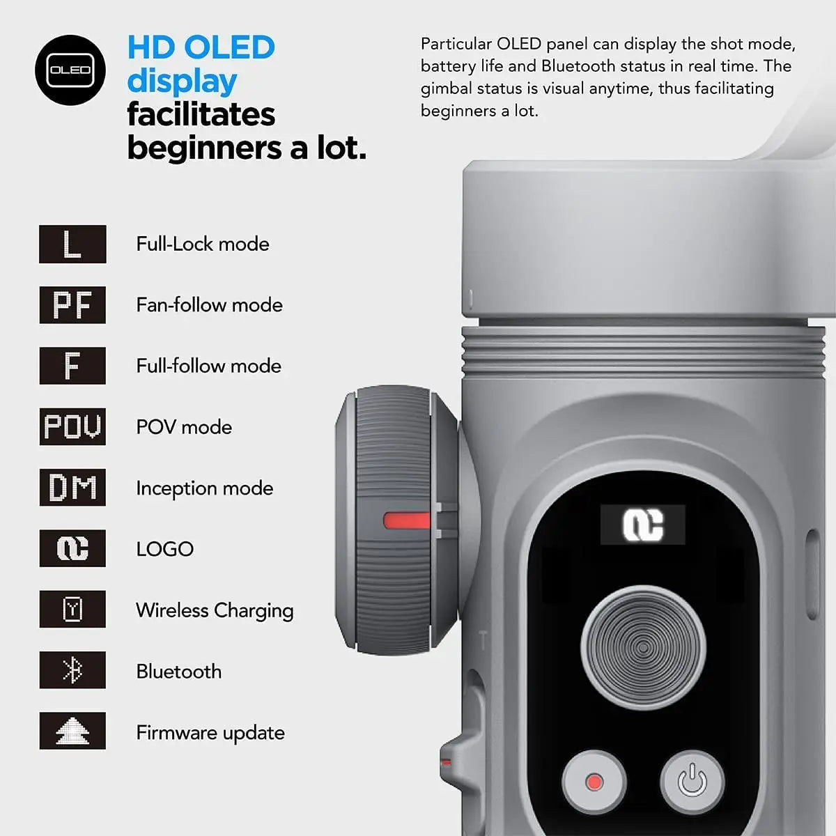 Fast folding and OLED display, weighing only 310 grams, fast folding and storage, compact and lightweight, suitable for light travel in outdoor photography; The special OLED display screen can display shooting mode, battery life, and the status of the universal joint can be seen at any time. Suitable for beginners to use.
