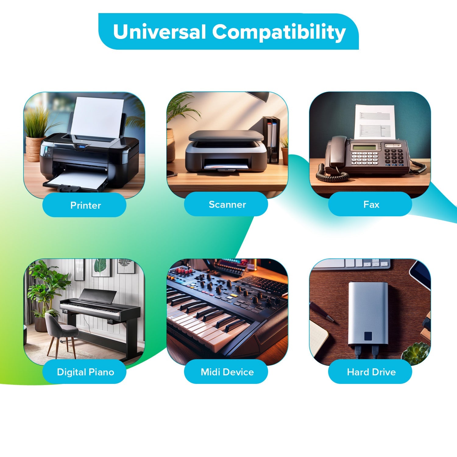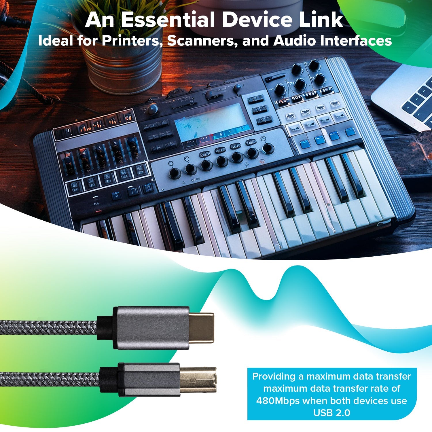 This Maplin USB-C to USB-B Braided Cable features USB-C male to USB B male connectors, ideal for adding printers, scanners and external drives to modern laptops. The cable has a fabric braided tangle free outer cover to ensure both durability and flexibility. Designed for long-lasting quality.