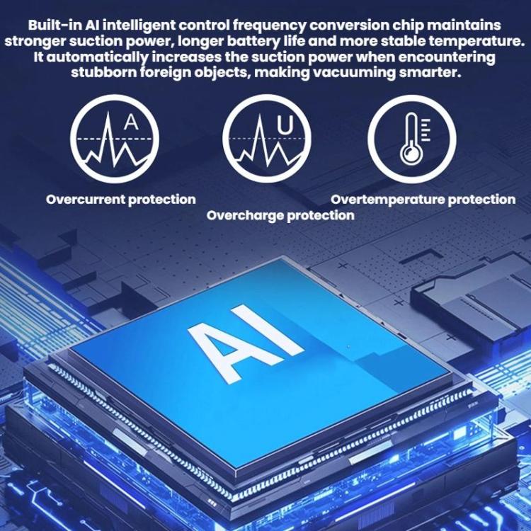 12. The built-in AI intelligent variable frequency chip maintains stronger suction, longer battery life, and more stable temperature. It automatically increases suction power for stubborn objects, making vacuuming even smarter.
