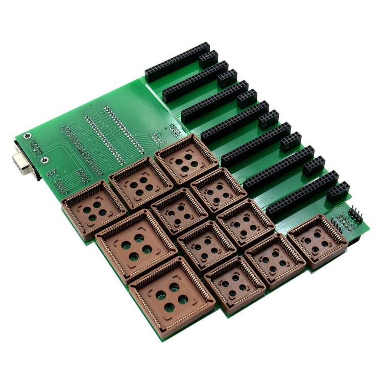 4. M-otorola MCUs: Pick the Adapter you want to use, attach the flat cable to the Adapter (PIN1 is always indicated, on both the cable and also the Adapter) and also to the 10pin ISP connector of main board. Select the VCC supply source by the jumper on the mainboard next to the ISP connector (on = target supplied from upa, off = target got own supply). Slide the Adapter over the soldered PLCC MCU on the target PCB. (No soldering, no pinout reviewing, no pin counting, saves lots of time and hassle and let you make your job faster, precise and easier)