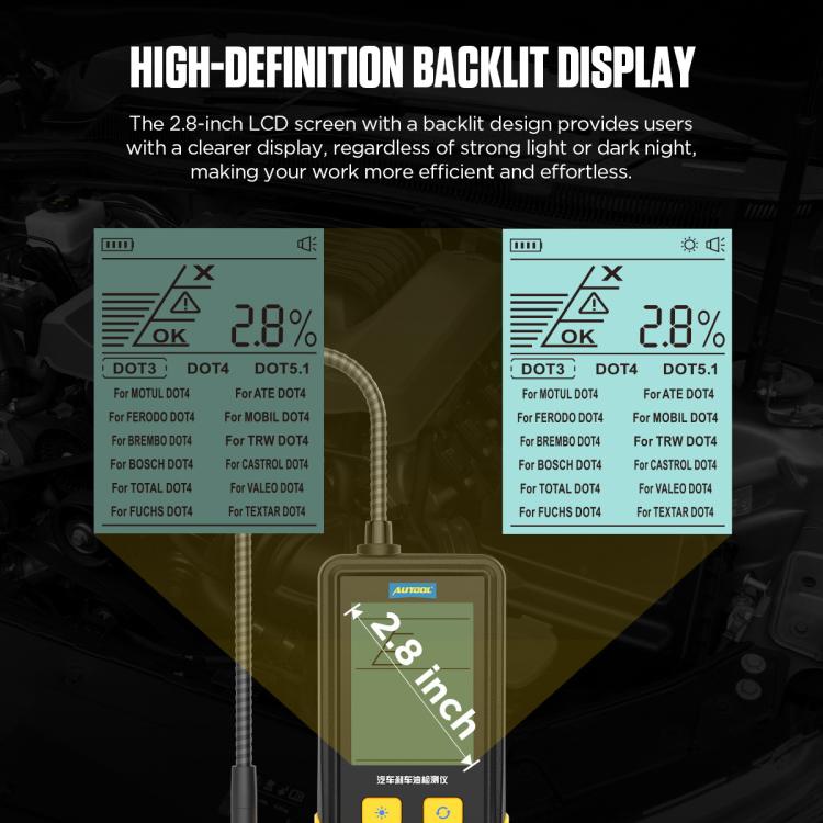 4. Brake pressure was transmitted by brake fluid, the pressure transmitter will out of function once brake fluid includes too much water. In order to safe-driving, we must test the water ratio scale in brake fluid regularly. The brake fluid tester helps us do current maintenance, and make sure we drive in safety condition.