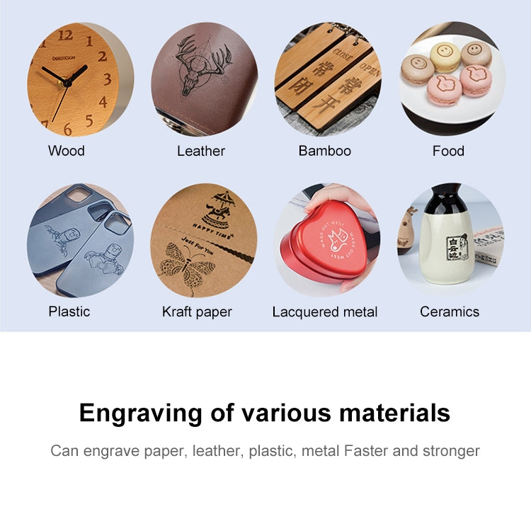9. Gracias a su innovador diseño de riel y fondo hueco, se puede colocar cualquier objeto y el área máxima de grabado es de 80 x 80 mm, lo que puede satisfacer las necesidades diarias.