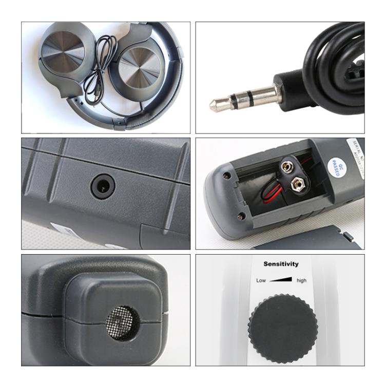 2. Adjust the sensitivity of the receiver (you can adjust the sensitivity to the maximum at the beginning), and then hold the receiver to slowly move along the measured object and listen to the sound from the headphones.