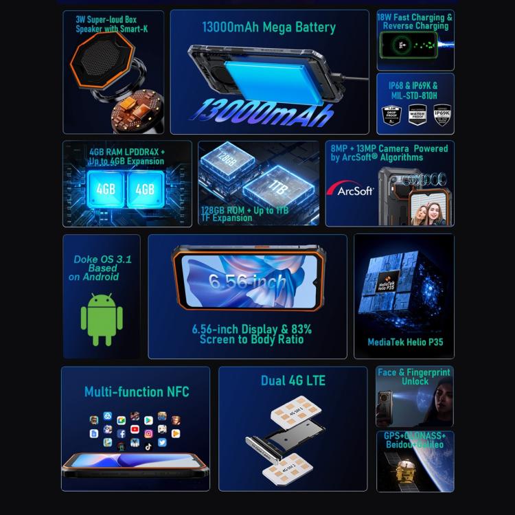 21. Protección: IP68/IP69K / MIL-STD-810H Resistente al agua, al polvo y a los golpes
