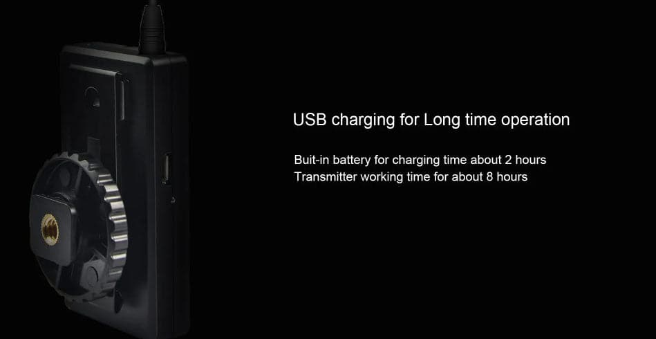 The Transmitter has a built-in battery lasts 6-8 hours and charges via USB.