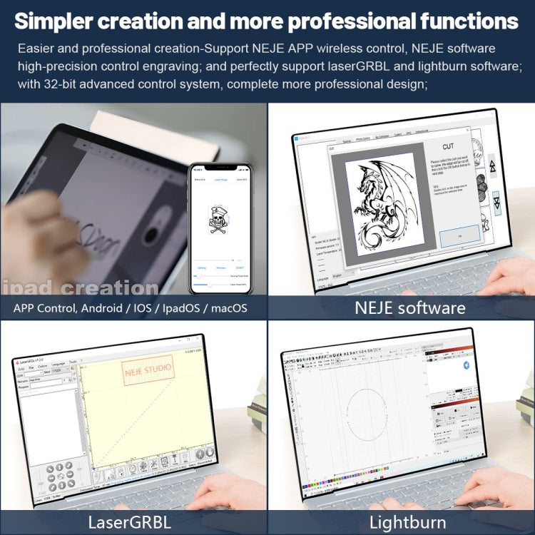5. Sistema de control de 32 bits, la velocidad más rápida alcanza los 250.000 mm/min, compatible con LaserGRBL, Lightburn, software NEJE, APLICACIÓN NEJE (Android, iOS, ipadOS, macOS), NEJE ofrece servicios de actualización de software gratuitos.