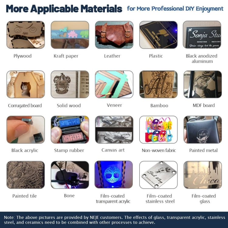12. Puede grabar: MDF/balsa/papel/madera/tela/plástico/cuero/madera contrachapada/espuma/aluminio anodizado