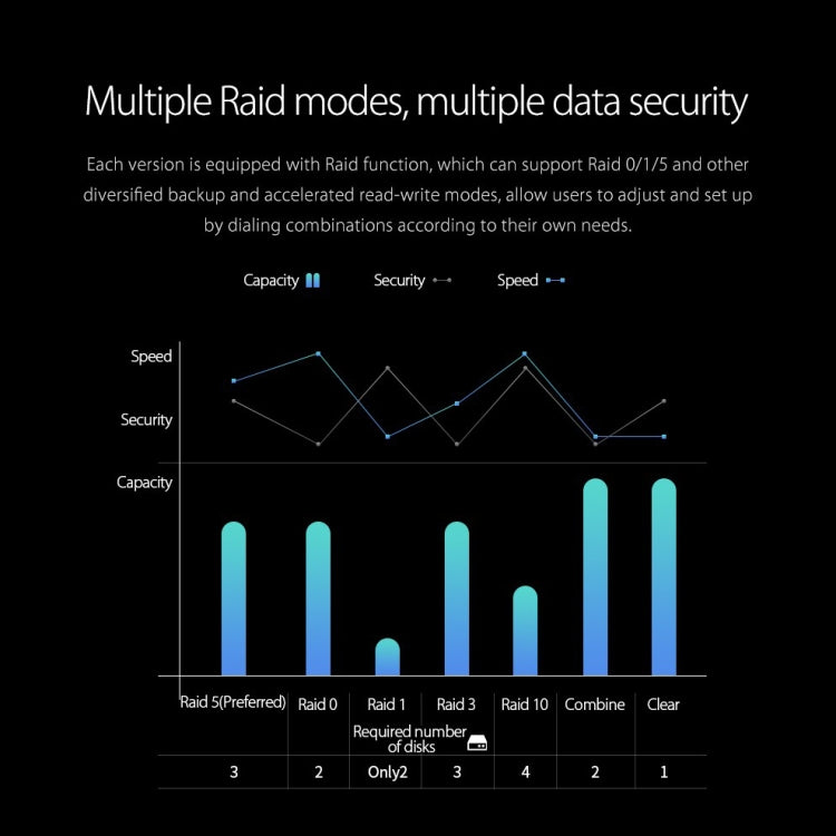 6. Support mode: RAID 0/1/3/5/10/JBOD/Clear.