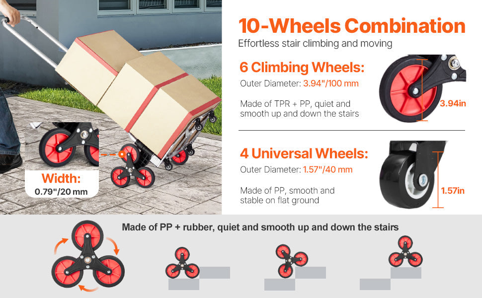 SPECIFICATIONSBrand Name: VEVOROrigin: Mainland ChinaHign-concerned Chemical: NoneCertification: CELoad Capacity: 260lbsBrand: VEVORLoad Capacity: 260lbsType: Stair Climbing CartMaterial: Carbon Steel+TPR+PPItem Weight: 5.4kg... Leer más...