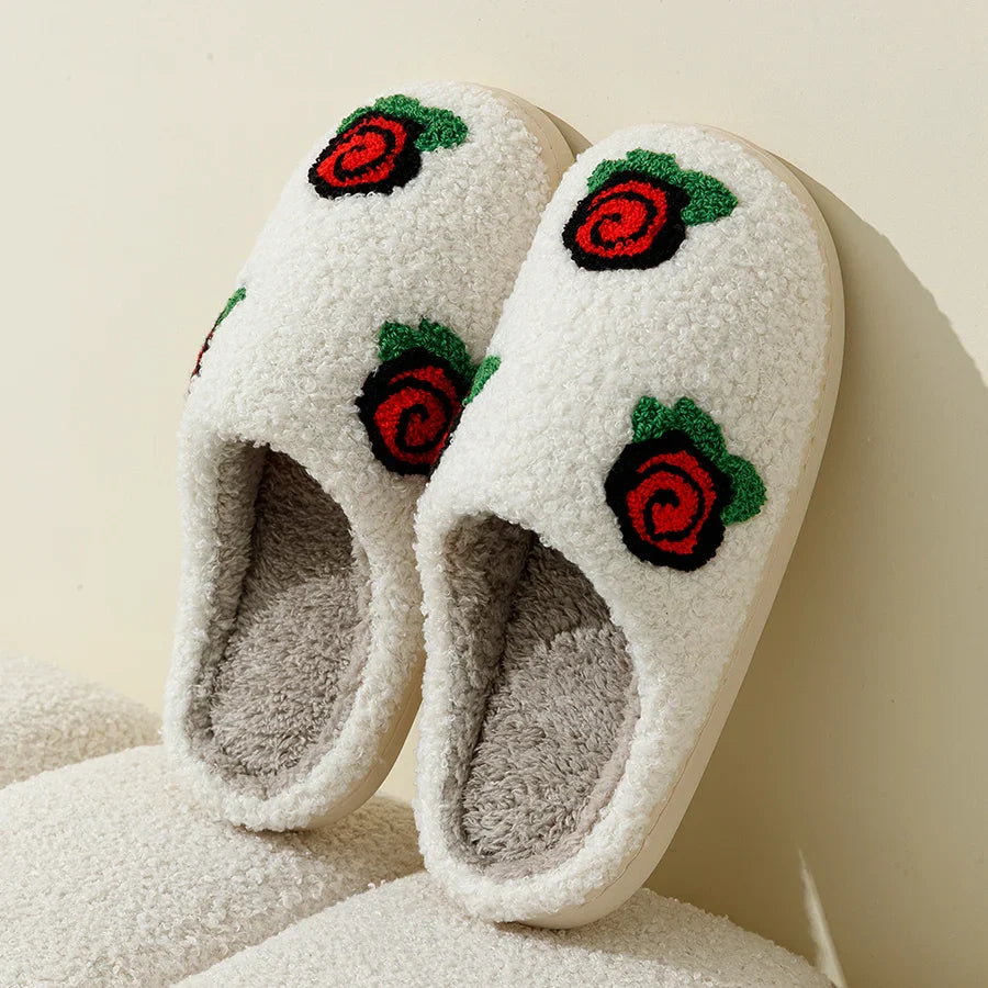 Women's Slippers Valentine's Day Rose Embroidery Fuzzy Romantic Love Comfy Flat Girl Valentine Gift Winter Home Shoes