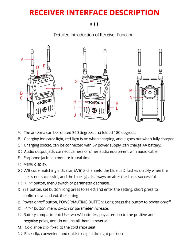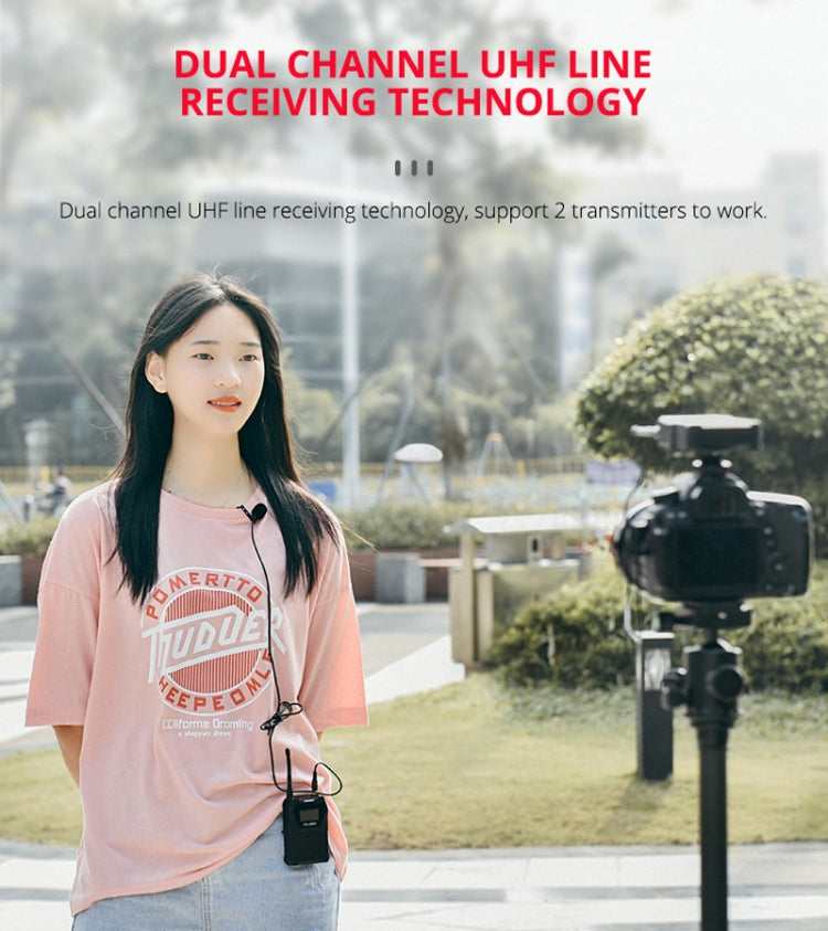 1. Dual-channel UHF line receiving technology, supporting 2 transmitters to work.