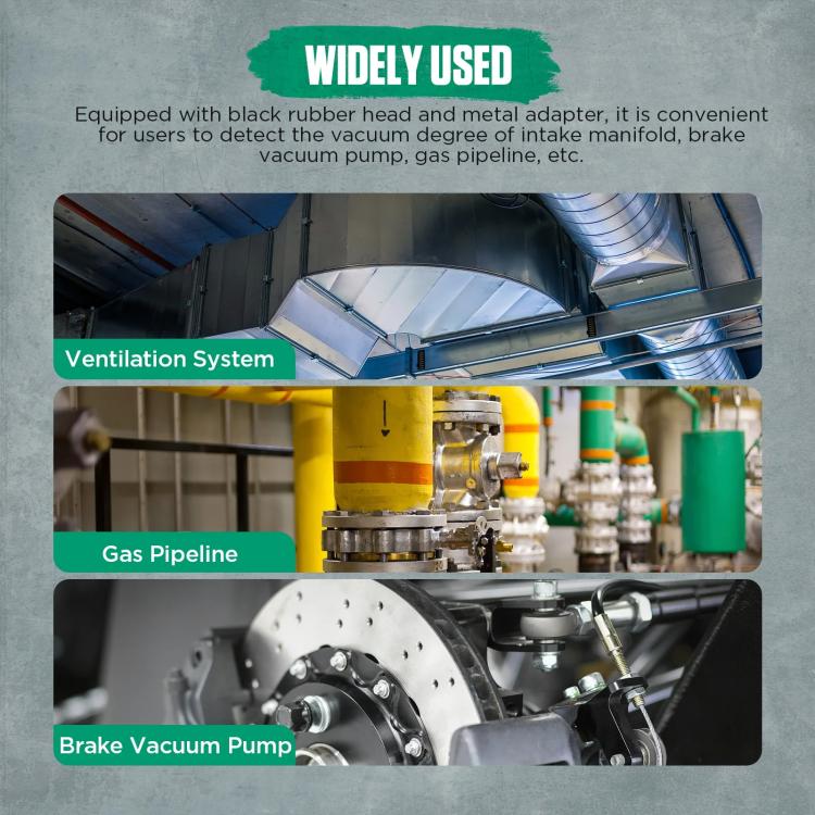 7. Equipped with black rubber head and metal connector, it is convenient for users to detect the vacuum degree of intake manifold, brake vacuum pump, 8. gas pipeline, etc.