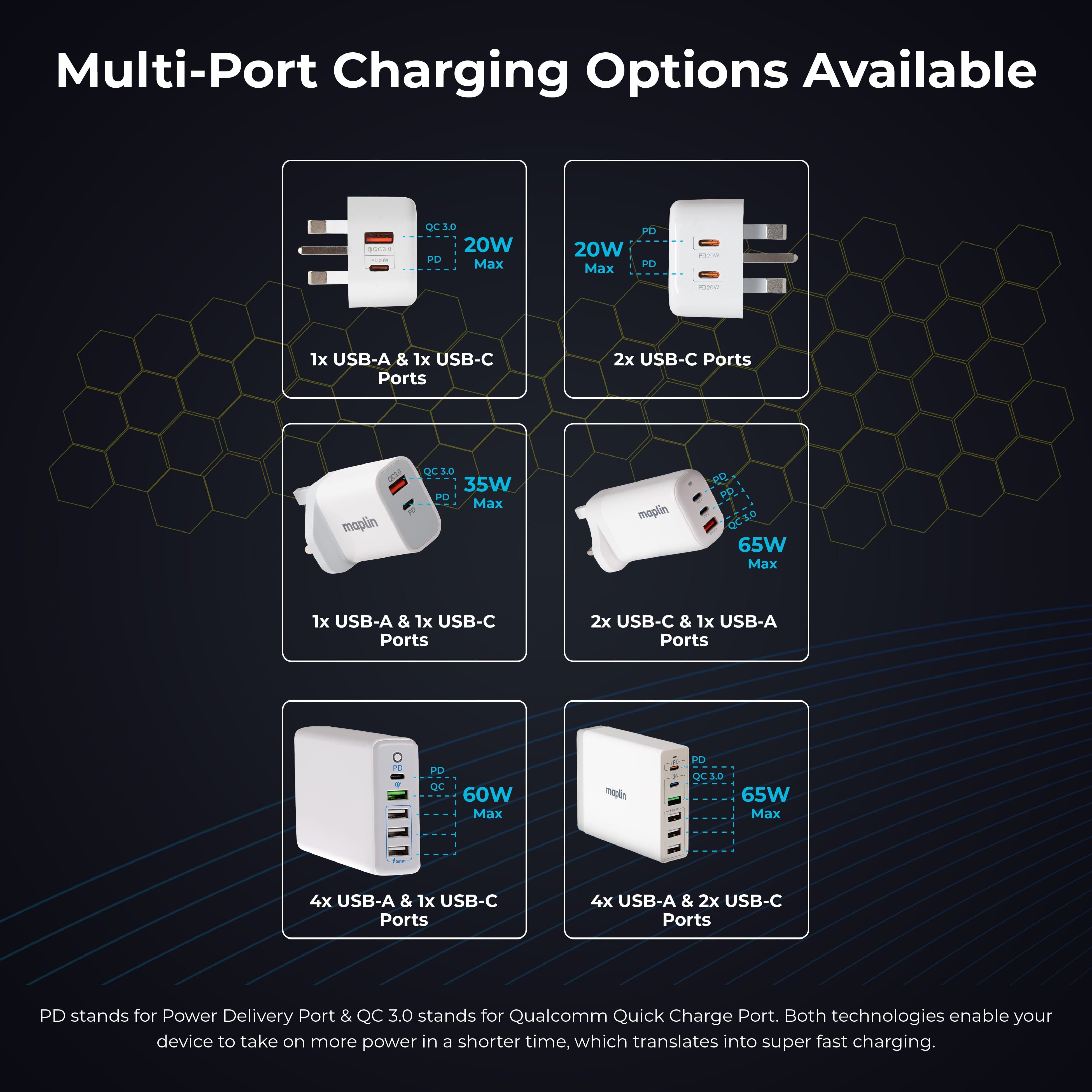 Designed to meet the needs of the latest USB-C and USB-A devices on the market, the Maplin 6 Port USB Charging Station 4x USB-A / 2x USB-C 65W High Speed Charging with 1m Cable delivering up to 65 Watts of power at one time.