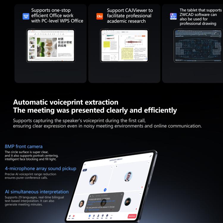 3. Display: 11.2 inch 3.2K LCD screen, 3200x2136 resolution, 345 PPI, up to 800nit brightness, up to 144Hz refresh rate, up to 360Hz finger touch sampling rate, 240Hz stylus touch sampling rate, support Dolby Vision, Rheinland hardware low blue light, no flicker, rhythm friendly certification.