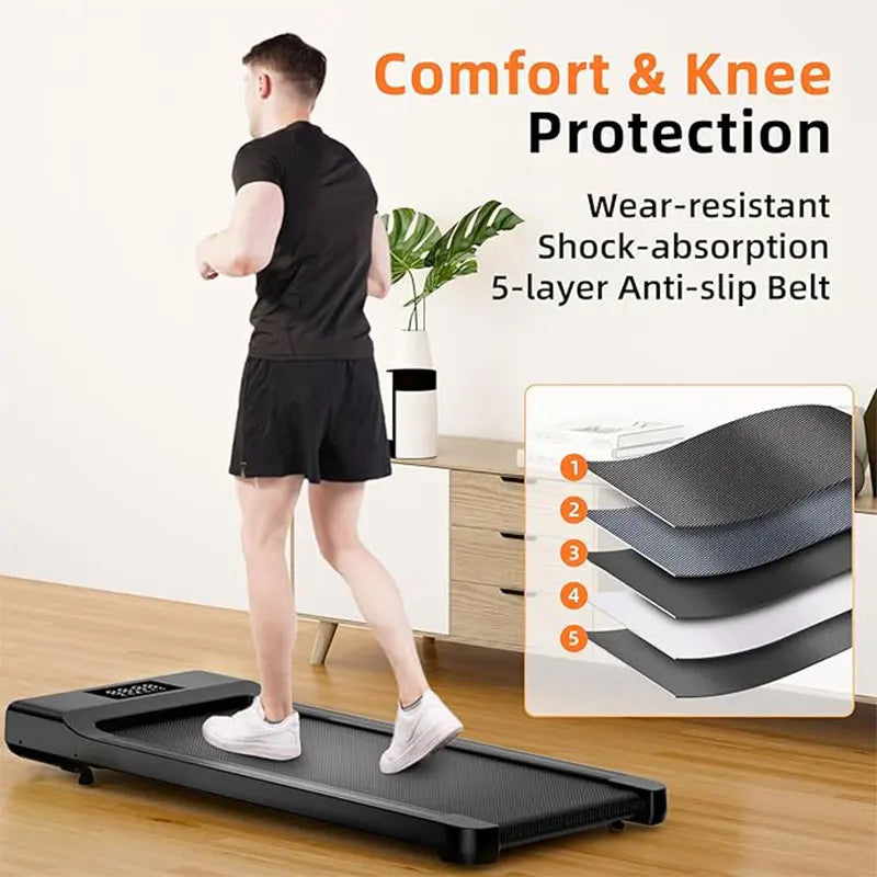 【5-Layer Anti-Slip Running Belt】The running belt of this walking pad adopts a 5-layer anti-slip shock absorption design to increase the safety of the exercise process. This walking pad can better shock absorption and protect the knees, enjoy a more secure and comfortable exercise experience
