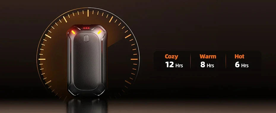 2Pack hand warmers have a total of 4000mAh battery capacity. One full charge provides up to 12 hours of continuous use, offering you warmth throughout the entire day. 3 temperature levels to for your choice, you can clearly see the temperature level and remaining battery power through the LED indicator light