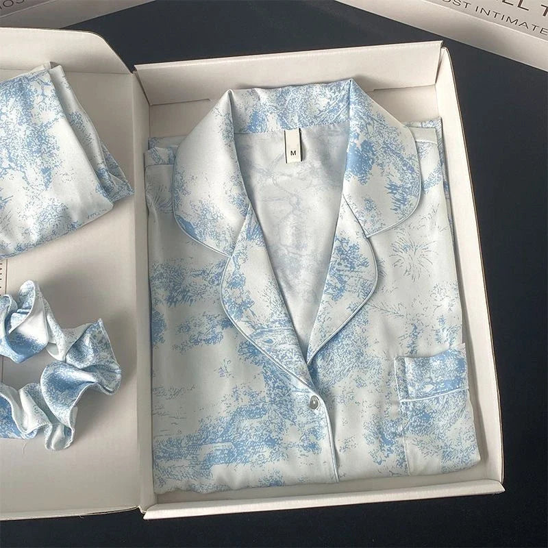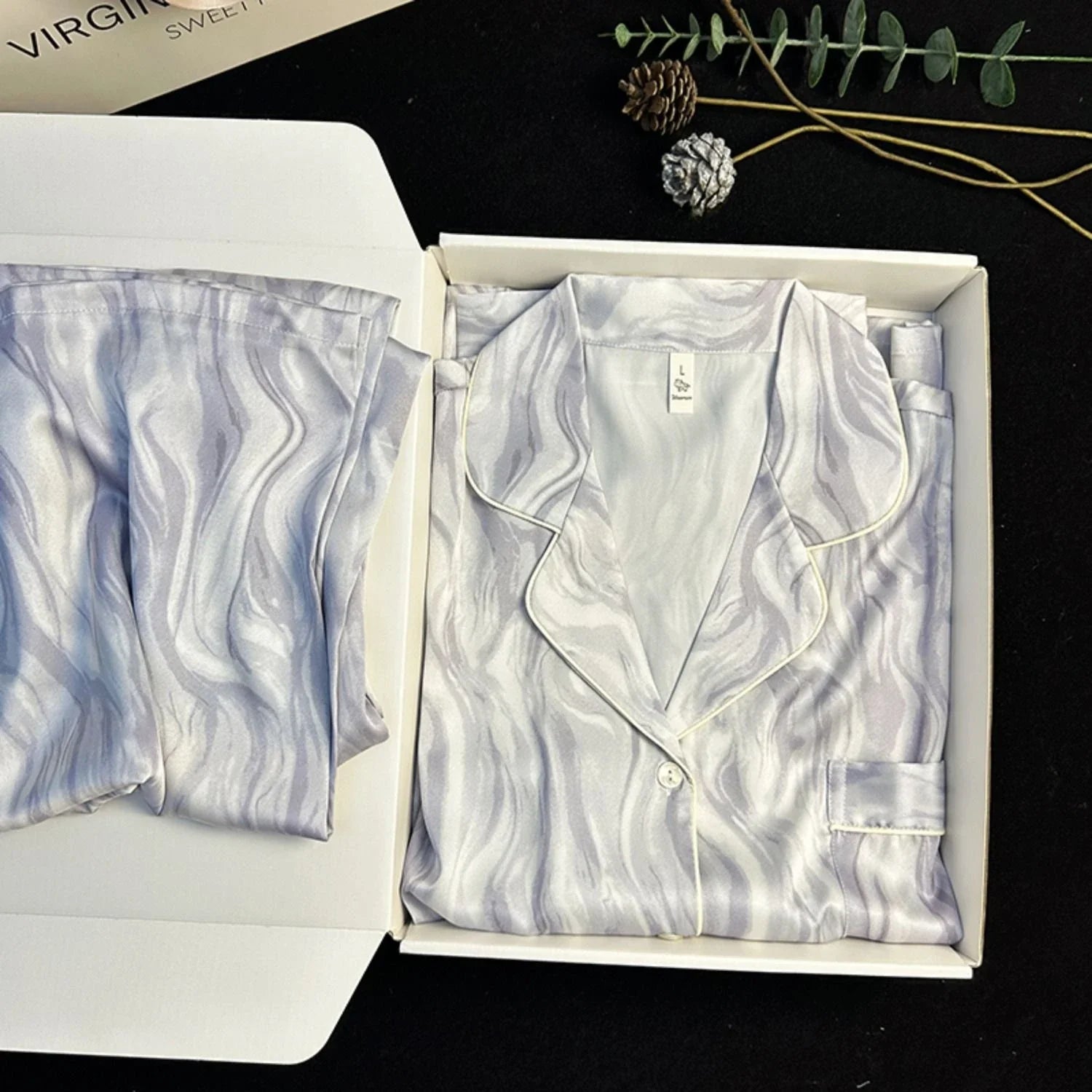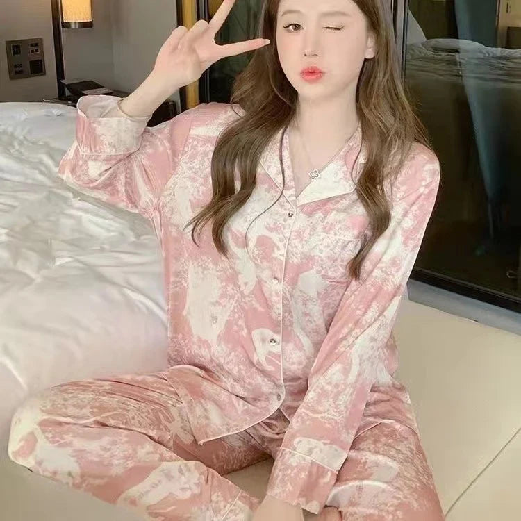 2023 Autumn New Ice Silk Women Pajama Lapel Button Cardigan Outfits for Women 2 Piece Set Fashion Printing Set Clothes for Women