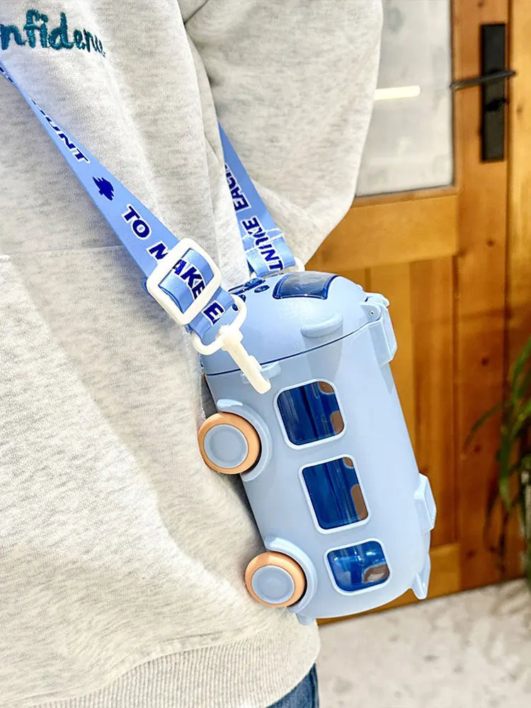 500ML Bus Shape Cartoon Water Cup with Movable Wheels & Strap Plastic Drinking Bottle Leakproof for Home Travel School