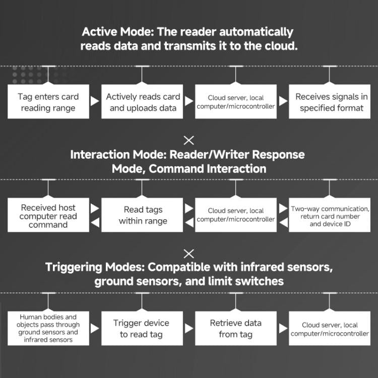 9. Card Reading Modes: Timed automatic reading, external trigger-controlled reading, command-based interactive reading