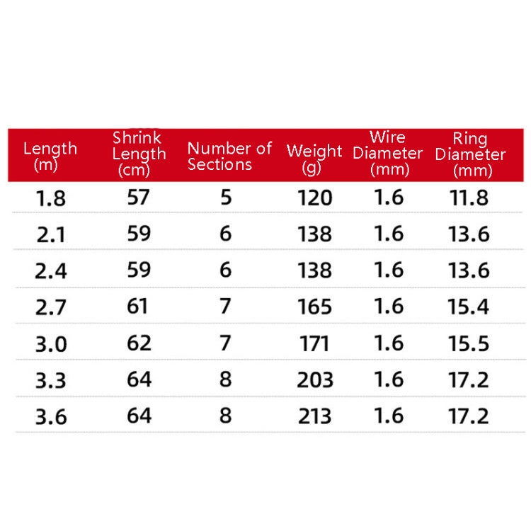 1. Material: carbon2. Applicable places: rivers, lakes, ponds, oceans3. Length: 1.8/2.1/2.4/2.7/3.0/3.3/3.6m4. Number of knots: 5 knots of 1.8m, 6 knots... Read more