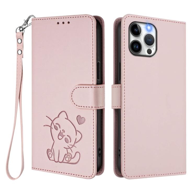 Embossed Heart Cat Leather Phone Case with Hand Strap, For iPhone 12 Pro Max, For iPhone 12 mini