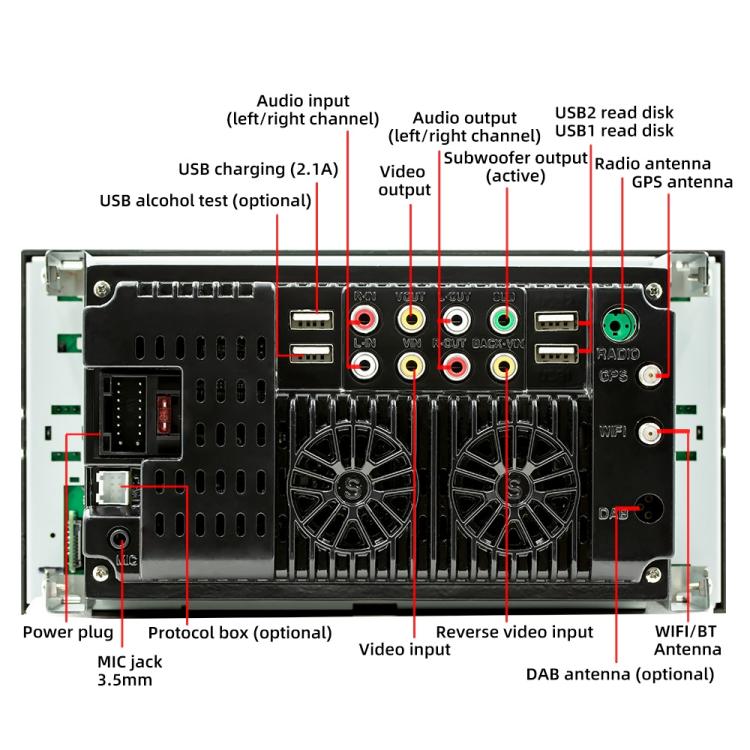 15. Support mobile phone interconnection, video warning playback, video output, offline map, driving recorder (USB signal input), GPS navigation, external microphone interface, reset button