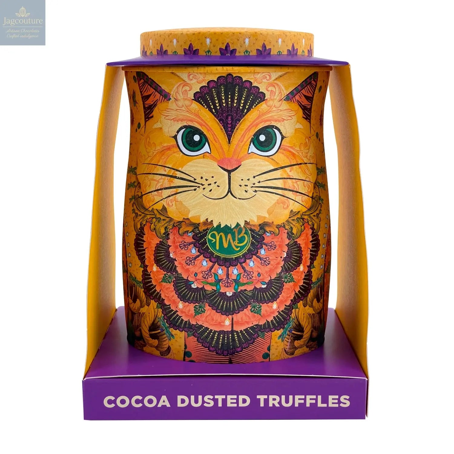 Savanna gold cat tin of Flutter Scotch flavoured cocoa dusted truffles with butterscotch chips - Outer: 12UTC1UTCSat, 06 Jan 1900 00:00:00 +0000amSaturday