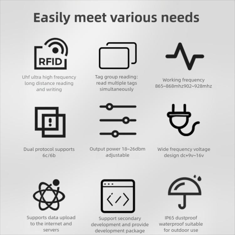 1. Card reading distance 0-10m, adjustable power 18-26dBm