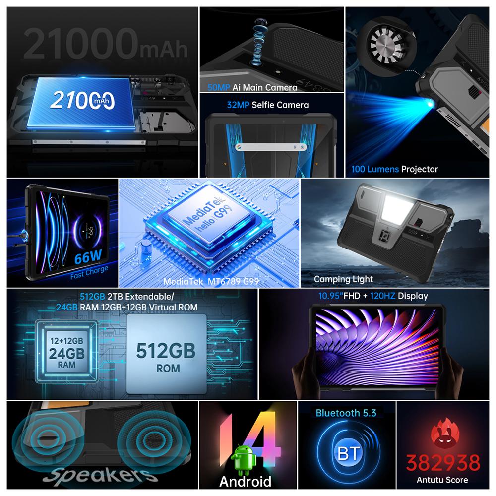 Unihertz 8849 Tank Pad E Rugged Tablet PC & Projector, 12GB+512GB, 10.95 inch Android 14 MT6789 Octa Core 4G Network, EU Plug